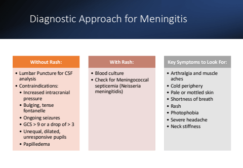 Diagnostic Approach for MeningitisWithout Rash:%u2022 Lumbar Puncture for CSF analysis%u2022 Contraindications:%u2022 Increased intracranial pressure%u2022 Bulging, tense fontanelle%u2022 Ongoing seizures%u2022 GCS > 9 or a drop of > 3%u2022 Unequal, dilated, unresponsive pupils%u2022 PapilledemaWith Rash:%u2022 Blood culture%u2022 Check for Meningococcal septicemia (Neisseria meningitidis)Key Symptoms to Look For:%u2022 Arthralgia and muscle aches%u2022 Cold periphery%u2022 Pale or mottled skin%u2022 Shortness of breath%u2022 Rash%u2022 Photophobia%u2022 Severe headache%u2022 Neck stiffness