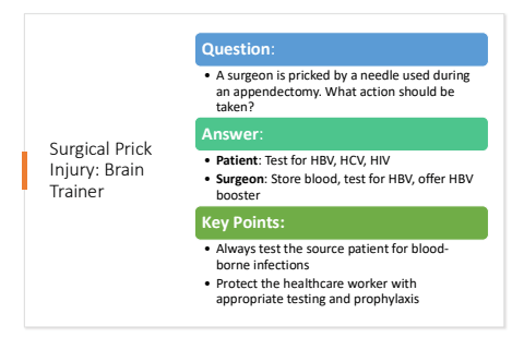 Surgical Prick Injury: Brain TrainerQuestion:%u2022 A surgeon is pricked by a needle used during an appendectomy. What action should be taken?Answer:%u2022 Patient: Test for HBV, HCV, HIV%u2022 Surgeon: Store blood, test for HBV, offer HBV boosterKey Points:%u2022 Always test the source patient for bloodborne infections%u2022 Protect the healthcare worker with appropriate testing and prophylaxis