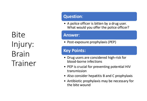 Bite Injury: Brain TrainerQuestion:%u2022 A police officer is bitten by a drug user. What would you offer the police officer?Answer:%u2022 Post-exposure prophylaxis (PEP)Key Points:%u2022 Drug users are considered high-risk for blood-borne infections%u2022 PEP is crucial for preventing potential HIV transmission%u2022 Also consider hepatitis B and C prophylaxis%u2022 Antibiotic prophylaxis may be necessary for the bite wound
