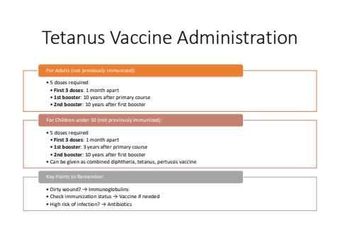 Tetanus Vaccine Administration%u2022 5 doses required%u2022 First 3 doses: 1 month apart%u2022 1st booster: 10 years after primary course%u2022 2nd booster: 10 years after first boosterFor Adults (not previously immunized):%u2022 5 doses required%u2022 First 3 doses: 1 month apart%u2022 1st booster: 3 years after primary course%u2022 2nd booster: 10 years after first booster%u2022 Can be given as combined diphtheria, tetanus, pertussis vaccineFor Children under 10 (not previously immunized):%u2022 Dirty wound? %u2192 Immunoglobulins%u2022 Check immunization status %u2192 Vaccine if needed%u2022 High risk of infection? %u2192 AntibioticsKey Points to Remember: