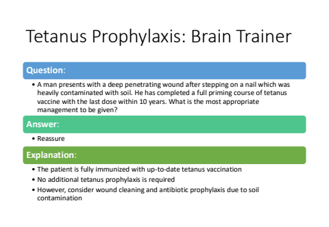 Tetanus Prophylaxis: Brain TrainerQuestion:%u2022 A man presents with a deep penetrating wound after stepping on a nail which was heavily contaminated with soil. He has completed a full priming course of tetanus vaccine with the last dose within 10 years. What is the most appropriate management to be given?Answer:%u2022 ReassureExplanation:%u2022 The patient is fully immunized with up-to-date tetanus vaccination%u2022 No additional tetanus prophylaxis is required%u2022 However, consider wound cleaning and antibiotic prophylaxis due to soil contamination