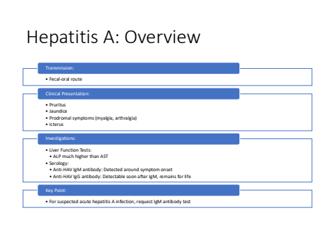 Hepatitis A: Overview%u2022 Fecal-oral routeTransmission:%u2022 Pruritus%u2022 Jaundice%u2022 Prodromal symptoms (myalgia, arthralgia)%u2022 IcterusClinical Presentation:%u2022 Liver Function Tests:%u2022 ALP much higher than AST%u2022 Serology:%u2022 Anti-HAV IgM antibody: Detected around symptom onset%u2022 Anti-HAV IgG antibody: Detectable soon after IgM, remains for lifeInvestigations:%u2022 For suspected acute hepatitis A infection, request IgM antibody testKey Point: