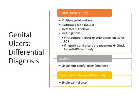 Genital Ulcers: Differential Diagnosis%u2022 Multiple painful ulcers%u2022 Associated with dysuria%u2022 Treatment: Aciclovir%u2022 Investigations:%u2022 Viral culture + NAAT or DNA detection using PCR%u2022 If negative and ulcers are recurrent %u2192 Check for anti-HSV antibodyGenital Herpes (HSV)%u2022 Single non-painful ulcer (chancre)Syphilis%u2022 Single painful ulcerHaemophilus ducreyi (Chancroid)