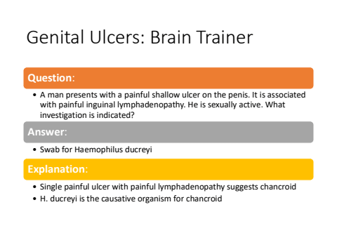 Genital Ulcers: Brain TrainerQuestion:%u2022 A man presents with a painful shallow ulcer on the penis. It is associated with painful inguinal lymphadenopathy. He is sexually active. What investigation is indicated?Answer:%u2022 Swab for Haemophilus ducreyiExplanation:%u2022 Single painful ulcer with painful lymphadenopathy suggests chancroid%u2022 H. ducreyi is the causative organism for chancroid