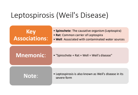 Leptospirosis (Weil's Disease)%u2022 Spirochete: The causative organism (Leptospira)%u2022 Rat: Common carrier of Leptospira%u2022 Well: Associated with contaminated water sourcesKey Associations:Mnemonic %u2022 \:%u2022 Leptospirosis is also known as Weil's disease in its Note: severe form