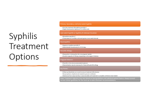 Syphilis Treatment OptionsPrimary, Secondary, and Early Latent Syphilis:%u2022 First-line treatment: Benzathine penicillin G%u2022 Single intramuscular injection of 2.4 million unitsLate Latent Syphilis or Syphilis of Unknown Duration:%u2022 Benzathine penicillin G%u2022 Three doses of 2.4 million units each, given at one-week intervalsNeurosyphilis:%u2022 Aqueous crystalline penicillin G%u2022 Administered intravenously for 10-14 daysPenicillin Allergy:%u2022 Doxycycline or tetracycline (for non-pregnant adults)%u2022 Duration typically 14-28 days, depending on the stage of infectionPregnant Women:%u2022 Penicillin is the only recommended treatment%u2022 Desensitization may be necessary for those with penicillin allergyKey Points:%u2022 Follow-up blood tests are crucial to ensure treatment effectiveness%u2022 Sexual partners should also be treated to prevent reinfection%u2022 Abstinence from sexual activity is recommended until treatment is complete and lesions have healedNote: Treatment regimens may vary based on local guidelines and individual patient factors. Always consult current clinical guidelines for the most up-to-date treatment recommendations.