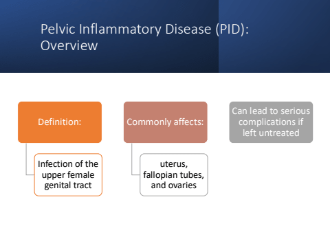 Pelvic Inflammatory Disease (PID): OverviewDefinition:Infection of the upper female genital tractCommonly affects:uterus, fallopian tubes, and ovariesCan lead to serious complications if left untreated