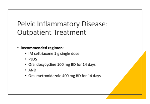 Pelvic Inflammatory Disease: Outpatient Treatment%u2022 Recommended regimen:%u2022 IM ceftriaxone 1 g single dose%u2022 PLUS%u2022 Oral doxycycline 100 mg BD for 14 days%u2022 AND%u2022 Oral metronidazole 400 mg BD for 14 days