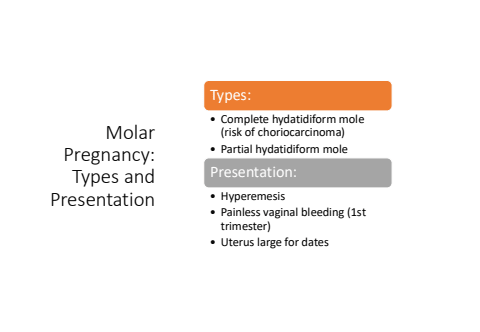 Molar Pregnancy: Types and PresentationTypes:%u2022 Complete hydatidiform mole (risk of choriocarcinoma)%u2022 Partial hydatidiform molePresentation:%u2022 Hyperemesis%u2022 Painless vaginal bleeding (1st trimester)%u2022 Uterus large for dates