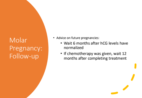 Molar Pregnancy: Follow-up%u2022 Advice on future pregnancies:%u2022 Wait 6 months after hCG levels have normalized%u2022 If chemotherapy was given, wait 12 months after completing treatment