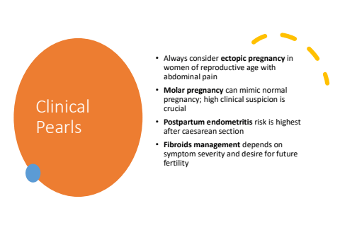 Clinical Pearls%u2022 Always consider ectopic pregnancy in women of reproductive age with abdominal pain%u2022 Molar pregnancy can mimic normal pregnancy; high clinical suspicion is crucial%u2022 Postpartum endometritis risk is highest after caesarean section%u2022 Fibroids management depends on symptom severity and desire for future fertility
