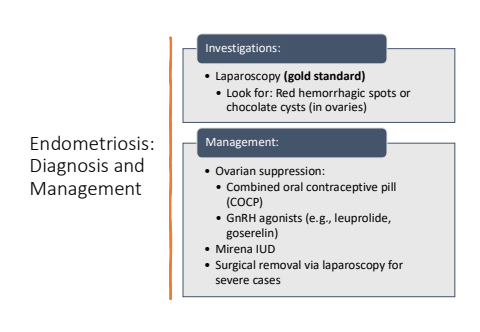 Endometriosis: Diagnosis and Management%u2022 Laparoscopy (gold standard)%u2022 Look for: Red hemorrhagic spots or chocolate cysts (in ovaries)Investigations:%u2022 Ovarian suppression:%u2022 Combined oral contraceptive pill (COCP)%u2022 GnRH agonists (e.g., leuprolide, goserelin)%u2022 Mirena IUD%u2022 Surgical removal via laparoscopy for severe casesManagement: