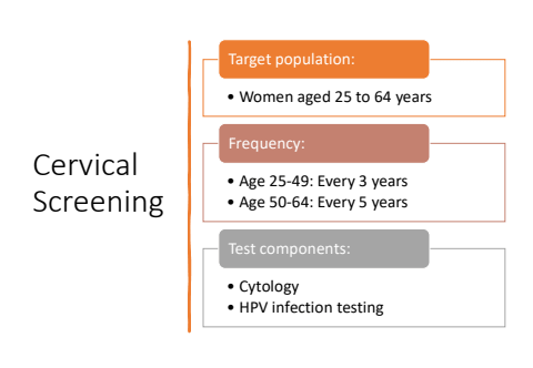Cervical Screening%u2022 Women aged 25 to 64 yearsTarget population:%u2022 Age 25-49: Every 3 years%u2022 Age 50-64: Every 5 yearsFrequency:%u2022 Cytology%u2022 HPV infection testingTest components: