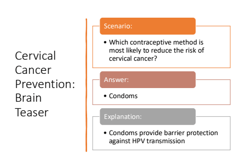 Cervical Cancer Prevention: Brain Teaser%u2022 Which contraceptive method is most likely to reduce the risk of cervical cancer?Scenario:%u2022 CondomsAnswer:%u2022 Condoms provide barrier protection against HPV transmissionExplanation: