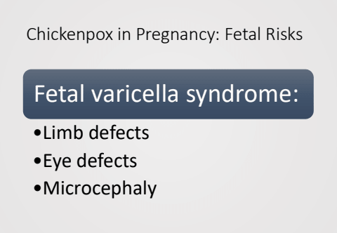 Chickenpox in Pregnancy: Fetal RisksFetal varicella syndrome:%u2022Limb defects%u2022Eye defects%u2022Microcephaly