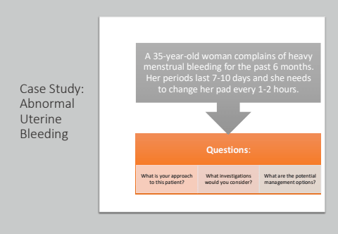 Case Study: Abnormal Uterine BleedingQuestions:What is your approach to this patient?What investigations would you consider?What are the potential management options?A 35-year-old woman complains of heavy menstrual bleeding for the past 6 months. Her periods last 7-10 days and she needs to change her pad every 1-2 hours.