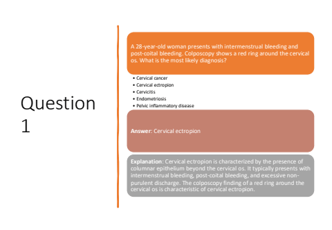 Question 1A 28-year-old woman presents with intermenstrual bleeding and post-coital bleeding. Colposcopy shows a red ring around the cervical os. What is the most likely diagnosis?%u2022 Cervical cancer%u2022 Cervical ectropion%u2022 Cervicitis%u2022 Endometriosis%u2022 Pelvic inflammatory diseaseAnswer: Cervical ectropionExplanation: Cervical ectropion is characterized by the presence of columnar epithelium beyond the cervical os. It typically presents with intermenstrual bleeding, post-coital bleeding, and excessive nonpurulent discharge. The colposcopy finding of a red ring around the cervical os is characteristic of cervical ectropion.