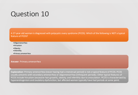 Question 10A 27-year-old woman is diagnosed with polycystic ovary syndrome (PCOS). Which of the following is NOT a typical feature of PCOS?%u2022Oligomenorrhea%u2022Hirsutism%u2022Obesity%u2022Infertility%u2022Primary amenorrheaAnswer: Primary amenorrheaExplanation: Primary amenorrhea (never having had a menstrual period) is not a typical feature of PCOS. PCOS usually presents with secondary amenorrhea or oligomenorrhea (infrequent periods). Other typical features of PCOS include hirsutism (excessive hair growth), obesity, and infertility due to anovulation. PCOS is characterized by hyperandrogenism and ovulatory dysfunction, but affected women typically have had periods at some point.