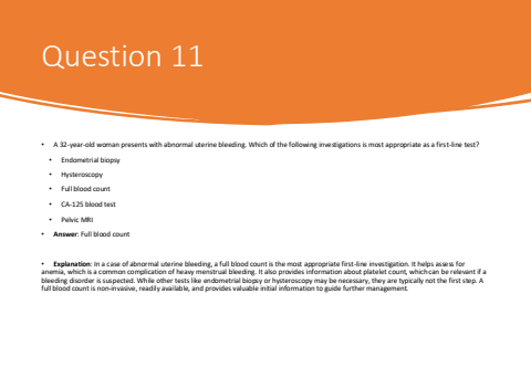 Question 11%u2022 A 32-year-old woman presents with abnormal uterine bleeding. Which of the following investigations is most appropriate as a first-line test?%u2022 Endometrial biopsy%u2022 Hysteroscopy%u2022 Full blood count%u2022 CA-125 blood test%u2022 Pelvic MRI%u2022 Answer: Full blood count%u2022 Explanation: In a case of abnormal uterine bleeding, a full blood count is the most appropriate first-line investigation. It helps assess for anemia, which is a common complication of heavy menstrual bleeding. It also provides information about platelet count, which can be relevant if a bleeding disorder is suspected. While other tests like endometrial biopsy or hysteroscopy may be necessary, they are typically not the first step. A full blood count is non-invasive, readily available, and provides valuable initial information to guide further management.