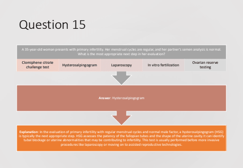 Question 15Explanation: In the evaluation of primary infertility with regular menstrual cycles and normal male factor, a hysterosalpingogram (HSG) is typically the next appropriate step. HSG assesses the patency of the fallopian tubes and the shape of the uterine cavity. It can identify tubal blockage or uterine abnormalities that may be contributing to infertility. This test is usually performed before more invasive procedures like laparoscopy or moving on to assisted reproductive technologies.Answer: HysterosalpingogramA 35-year-old woman presents with primary infertility. Her menstrual cycles are regular, and her partner's semen analysis is normal. What is the most appropriate next step in her evaluation?Clomiphene citrate challenge test Hysterosalpingogram Laparoscopy In vitro fertilization Ovarian reserve testing