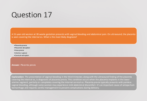 Question 17A 31-year-old woman at 28 weeks gestation presents with vaginal bleeding and abdominal pain. On ultrasound, the placenta is seen covering the internal os. What is the most likely diagnosis?%u2022Placenta previa%u2022Placental abruption%u2022Vasa previa%u2022Uterine rupture%u2022Cervical ectropionAnswer: Placenta previaExplanation: The presentation of vaginal bleeding in the third trimester, along with the ultrasound finding of the placenta covering the internal os, is diagnostic of placenta previa. This condition occurs when the placenta implants in the lower uterine segment, partially or completely covering the internal cervical os. Placenta previa typically presents with painless vaginal bleeding, although some women may experience mild abdominal discomfort. It's an important cause of antepartum hemorrhage and requires careful management to prevent complications during delivery.