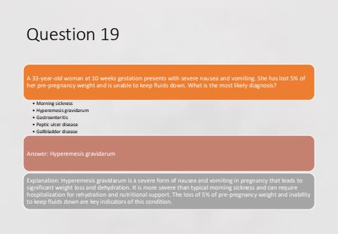 Question 19A 33-year-old woman at 10 weeks gestation presents with severe nausea and vomiting. She has lost 5% of her pre-pregnancy weight and is unable to keep fluids down. What is the most likely diagnosis?%u2022 Morning sickness%u2022 Hyperemesis gravidarum%u2022 Gastroenteritis%u2022 Peptic ulcer disease%u2022 Gallbladder diseaseAnswer: Hyperemesis gravidarumExplanation: Hyperemesis gravidarum is a severe form of nausea and vomiting in pregnancy that leads to significant weight loss and dehydration. It is more severe than typical morning sickness and can require hospitalization for rehydration and nutritional support. The loss of 5% of pre-pregnancy weight and inability to keep fluids down are key indicators of this condition.