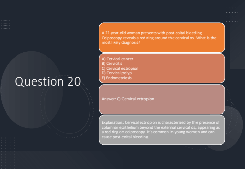 Question 20A 22-year-old woman presents with post-coital bleeding. Colposcopy reveals a red ring around the cervical os. What is the most likely diagnosis?A) Cervical cancerB) CervicitisC) Cervical ectropionD) Cervical polypE) EndometriosisAnswer: C) Cervical ectropionExplanation: Cervical ectropion is characterized by the presence of columnar epithelium beyond the external cervical os, appearing as a red ring on colposcopy. It's common in young women and can cause post-coital bleeding.