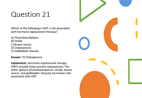Question 21Which of the following is NOT a risk associated with hormone replacement therapy?A) ThromboembolismB) StrokeC) Breast cancerD) OsteoporosisE) Gallbladder diseaseAnswer: D) OsteoporosisExplanation: Hormone replacement therapy (HRT) actually helps prevent osteoporosis. The other options (thromboembolism, stroke, breast cancer, and gallbladder disease) are known risks associated with HRT.