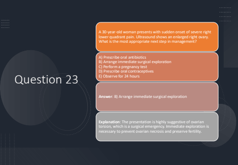 Question 23A 30-year-old woman presents with sudden onset of severe right lower quadrant pain. Ultrasound shows an enlarged right ovary. What is the most appropriate next step in management?A) Prescribe oral antibioticsB) Arrange immediate surgical explorationC) Perform a pregnancy testD) Prescribe oral contraceptivesE) Observe for 24 hoursAnswer: B) Arrange immediate surgical explorationExplanation: The presentation is highly suggestive of ovarian torsion, which is a surgical emergency. Immediate exploration is necessary to prevent ovarian necrosis and preserve fertility.