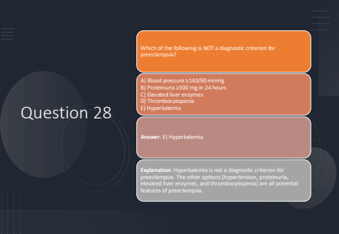 Question 28Which of the following is NOT a diagnostic criterion for preeclampsia?A) Blood pressure %u2265140/90 mmHgB) Proteinuria %u2265300 mg in 24 hoursC) Elevated liver enzymesD) ThrombocytopeniaE) HyperkalemiaAnswer: E) HyperkalemiaExplanation: Hyperkalemia is not a diagnostic criterion for preeclampsia. The other options (hypertension, proteinuria, elevated liver enzymes, and thrombocytopenia) are all potential features of preeclampsia.