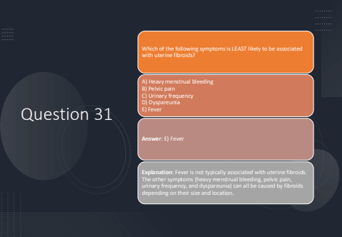 Question 31Which of the following symptoms is LEAST likely to be associated with uterine fibroids?A) Heavy menstrual bleedingB) Pelvic painC) Urinary frequencyD) DyspareuniaE) FeverAnswer: E) FeverExplanation: Fever is not typically associated with uterine fibroids. The other symptoms (heavy menstrual bleeding, pelvic pain, urinary frequency, and dyspareunia) can all be caused by fibroids depending on their size and location.