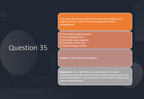 Question 35A 25-year-old woman presents with a painful swelling at the vaginal introitus. What is the most appropriate initial management?A) Immediate surgical excisionB) Oral antibiotics onlyC) Sitz baths and analgesicsD) Aspiration of the cystE) Topical estrogen creamAnswer: C) Sitz baths and analgesicsExplanation: For a Bartholin's cyst or abscess, the initial management typically involves conservative measures such as sitz baths and analgesics. This approach can often lead to spontaneous rupture and resolution.