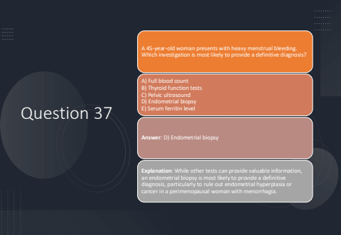 Question 37A 45-year-old woman presents with heavy menstrual bleeding. Which investigation is most likely to provide a definitive diagnosis?A) Full blood countB) Thyroid function testsC) Pelvic ultrasoundD) Endometrial biopsyE) Serum ferritin levelAnswer: D) Endometrial biopsyExplanation: While other tests can provide valuable information, an endometrial biopsy is most likely to provide a definitive diagnosis, particularly to rule out endometrial hyperplasia or cancer in a perimenopausal woman with menorrhagia.