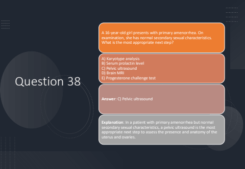 Question 38A 16-year-old girl presents with primary amenorrhea. On examination, she has normal secondary sexual characteristics. What is the most appropriate next step?A) Karyotype analysisB) Serum prolactin levelC) Pelvic ultrasoundD) Brain MRIE) Progesterone challenge testAnswer: C) Pelvic ultrasoundExplanation: In a patient with primary amenorrhea but normal secondary sexual characteristics, a pelvic ultrasound is the most appropriate next step to assess the presence and anatomy of the uterus and ovaries.