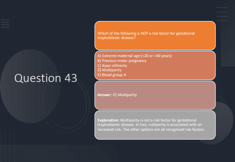 Question 43Which of the following is NOT a risk factor for gestational trophoblastic disease?A) Extreme maternal age (<20 or >40 years)B) Previous molar pregnancyC) Asian ethnicityD) MultiparityE) Blood group AAnswer: D) MultiparityExplanation: Multiparity is not a risk factor for gestational trophoblastic disease. In fact, nulliparity is associated with an increased risk. The other options are all recognized risk factors.