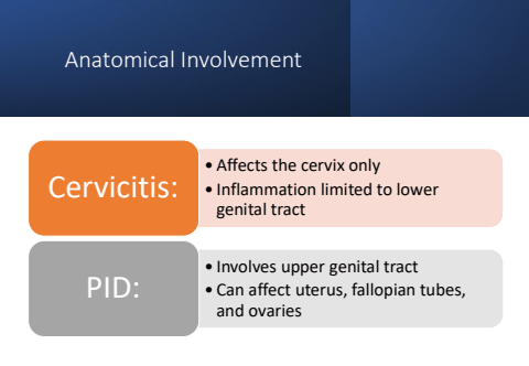 Anatomical Involvement%u2022 Affects the cervix only%u2022 Inflammation limited to lower genital tractCervicitis:%u2022 Involves upper genital tract%u2022 Can affect uterus, fallopian tubes, and ovariesPID: