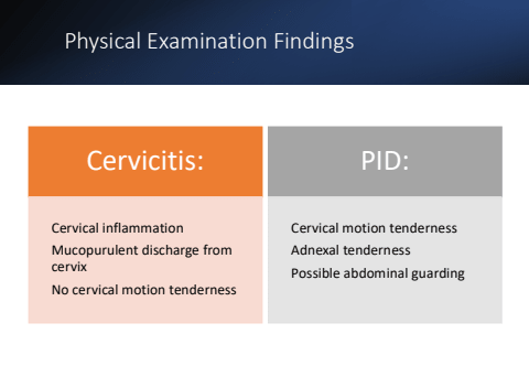 Physical Examination FindingsCervicitis:Cervical inflammationMucopurulent discharge from cervixNo cervical motion tendernessPID:Cervical motion tendernessAdnexal tendernessPossible abdominal guarding