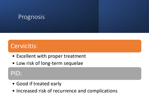 PrognosisCervicitis:%u2022 Excellent with proper treatment%u2022 Low risk of long-term sequelaePID:%u2022 Good if treated early%u2022 Increased risk of recurrence and complications