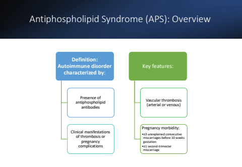 Antiphospholipid Syndrome (APS): OverviewDefinition: Autoimmune disorder characterized by:Presence of antiphospholipid antibodiesClinical manifestations of thrombosis or pregnancy complicationsKey features:Vascular thrombosis (arterial or venous)Pregnancy morbidity:%u2022%u22653 unexplained consecutive miscarriages before 10 weeks gestation%u2022%u22651 second-trimester miscarriage