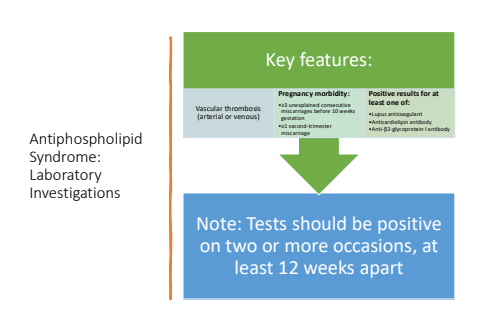 Antiphospholipid Syndrome: Laboratory InvestigationsNote: Tests should be positive on two or more occasions, at least 12 weeks apartKey features:Vascular thrombosis (arterial or venous)Pregnancy morbidity:%u2022%u22653 unexplained consecutive miscarriages before 10 weeks gestation%u2022%u22651 second-trimester miscarriagePositive results for at least one of:%u2022Lupus anticoagulant%u2022Anticardiolipin antibody%u2022Anti-%u03b22-glycoprotein I antibody