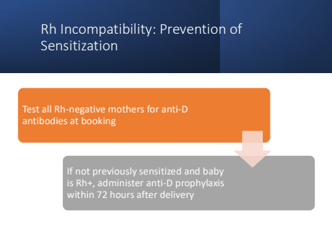 Rh Incompatibility: Prevention of SensitizationTest all Rh-negative mothers for anti-D antibodies at bookingIf not previously sensitized and baby is Rh+, administer anti-D prophylaxis within 72 hours after delivery