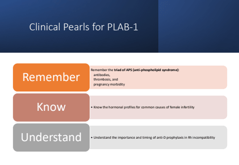 Clinical Pearls for PLAB-1Remember the triad of APS (anti-phospholipid syndrome):antibodies,thrombosis, andpregnancy morbidityRememberKnow %u2022 Know the hormonal profiles for common causes of female infertilityUnderstand %u2022 Understand the importance and timing of anti-D prophylaxis in Rh incompatibility