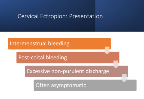 Cervical Ectropion: PresentationIntermenstrual bleedingPost-coital bleedingExcessive non-purulent dischargeOften asymptomatic