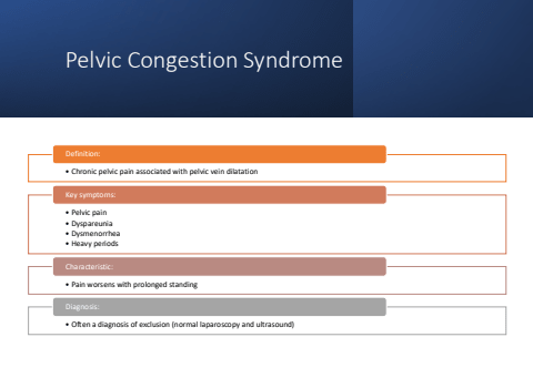 Pelvic Congestion Syndrome%u2022 Chronic pelvic pain associated with pelvic vein dilatationDefinition:%u2022 Pelvic pain%u2022 Dyspareunia%u2022 Dysmenorrhea%u2022 Heavy periodsKey symptoms:%u2022 Pain worsens with prolonged standingCharacteristic:%u2022 Often a diagnosis of exclusion (normal laparoscopy and ultrasound)Diagnosis: