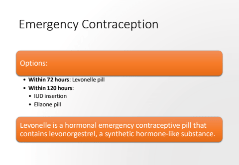 Emergency ContraceptionOptions:%u2022 Within 72 hours: Levonelle pill%u2022 Within 120 hours:%u2022 IUD insertion%u2022 Ellaone pillLevonelle is a hormonal emergency contraceptive pill that contains levonorgestrel, a synthetic hormone-like substance.