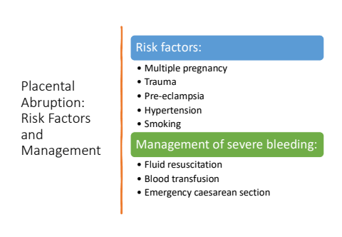 Placental Abruption: Risk Factors and ManagementRisk factors:%u2022 Multiple pregnancy%u2022 Trauma%u2022 Pre-eclampsia%u2022 Hypertension%u2022 SmokingManagement of severe bleeding:%u2022 Fluid resuscitation%u2022 Blood transfusion%u2022 Emergency caesarean section