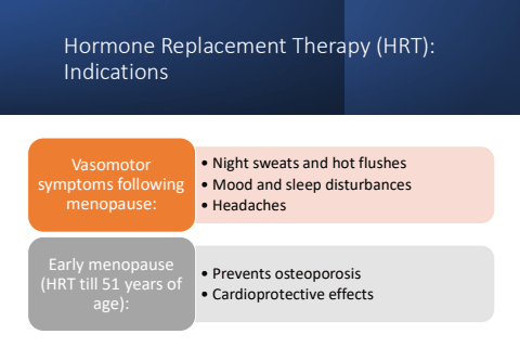 Hormone Replacement Therapy (HRT): Indications%u2022 Night sweats and hot flushes%u2022 Mood and sleep disturbances%u2022 HeadachesVasomotor symptoms following menopause:%u2022 Prevents osteoporosis%u2022 Cardioprotective effectsEarly menopause (HRT till 51 years of age):