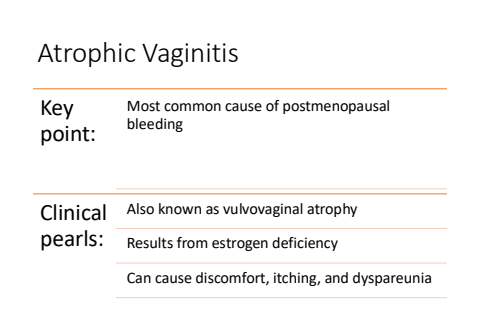 Atrophic VaginitisKey point:Most common cause of postmenopausal bleedingClinical pearls:Also known as vulvovaginal atrophyResults from estrogen deficiencyCan cause discomfort, itching, and dyspareunia
