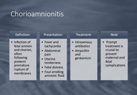 ChorioamnionitisDefinition:%u2022 Infection of fetal amnion and chorion, often following preterm premature rupture of membranesPresentation:%u2022 Fever and tachycardia%u2022 Abdominal pain%u2022 Uterine tenderness%u2022 Fetal distress%u2022 Foul-smelling amniotic fluidTreatment:%u2022 Intravenous antibiotics%u2022 Ampicillin and gentamicinNote%u2022 Prompt treatment is crucial to prevent maternal and fetal complications