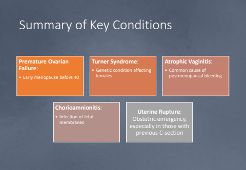 Summary of Key ConditionsPremature Ovarian Failure:%u2022 Early menopause before 40Turner Syndrome:%u2022 Genetic condition affecting femalesAtrophic Vaginitis:%u2022 Common cause of postmenopausal bleedingChorioamnionitis:%u2022 Infection of fetal membranesUterine Rupture: Obstetric emergency, especially in those with previous C-section